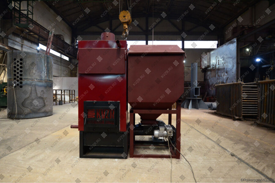 Отечественный котел на пеллетах с автоматической подачей мощностью от 0.15 до 1.5 МВт с бункером и вихревой топкой самостоятельно осуществляет розжиг, запуск, работу, регулировку давления и остановку агрегата в случае превышения допустимых параметров работы. Подача топлива осуществляется с контролем производительности по заданной температуре. Воздух подается в зависимости от объема загруженного топлива. В агрегате предусмотрена система пожаротушения в случае воспламенения топлива в топливопроводе. Благодаря конструкции вихревой топки котел может работать с древесными пеллетами любого качества.
