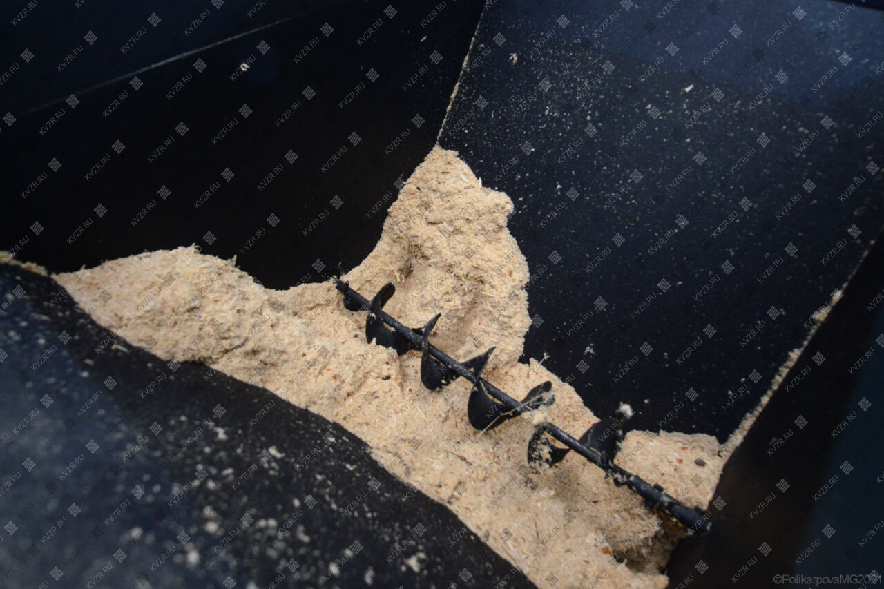 Конструкция букера содержит ворошитель. Бункер ворошитель для опилок предотвращает зависание топлива. Из бункера топливо подается шнековым питателем. Приводом питателя служит мотор редуктор. Для того, чтобы в шнековом питателе не возникло воспламенение топлива в конструкции предусмотрено воздушное охлаждение выходного узла.