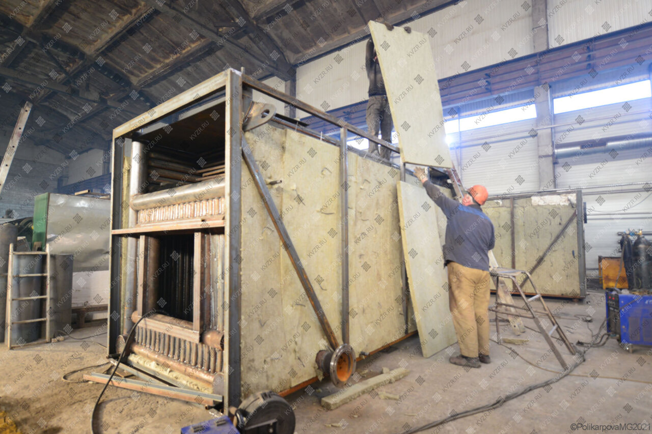 Снаружи трубной системы на газоплотные стенки водогрейного котла на отработке укладываются плиты из негорючей ваты. Плиты фиксируются штырями.